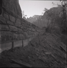 Road and rock retaining wall alongside road at the Zion-Mt. Carmel Highway tunnel. ; ZION Museum and Archives Image 002.02.01-14of16 ; ZION 15933