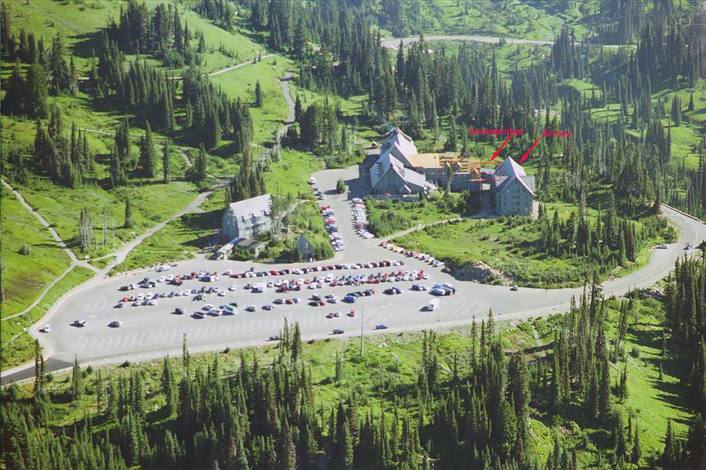 Aerial view of Paradise including Inn, Annex and Guide House 2007. Unstable rock wall Paradise Inn Annex, stone foundation Paradise Inn Annex, typical room at the Paradise Inn Annex, external view of Annex from west side 2007. Images show deficiencies in the structure that will require sesmic and fire code retrofit.