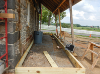 Framing for the front porch deck is being installed. A roll of galvanized fencing is also laid onto ground and will be buried to prevent groundhogs from burrowing under the porch.