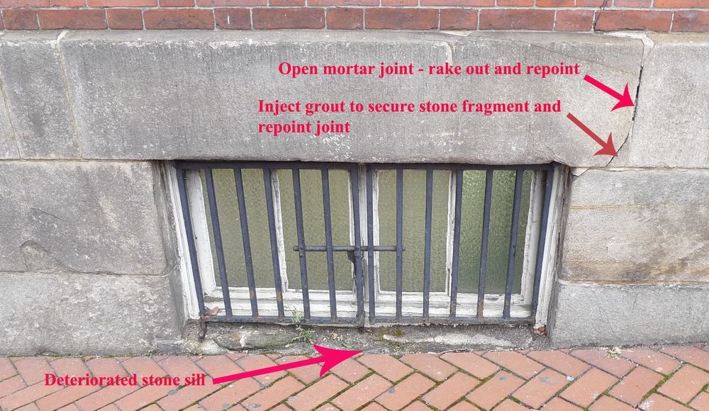 The photograph illustrates a typical watertable oopening deteriorated condition. The stone sill has complete deteriorated and iron bars are no longer anchored at their base. The stone lintel has cracked and the mortar joint is open. Arrows point to the areas needing repair.