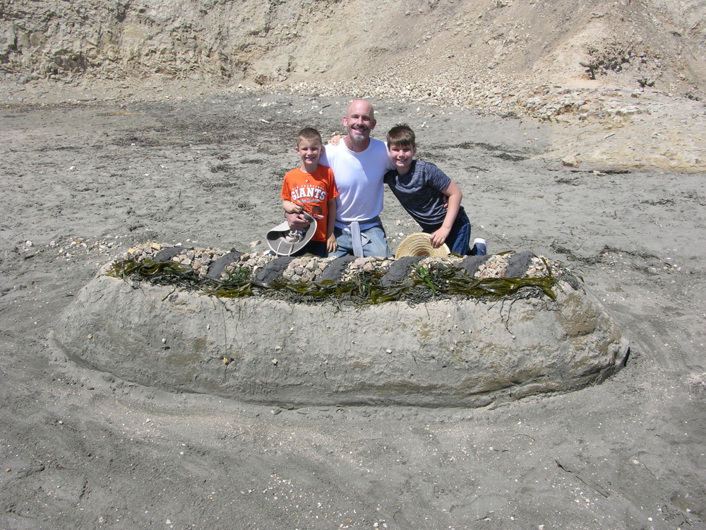 A man and two boys behind a sand sculpture of a large hotdog.