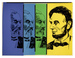 Multi-colored panels with multiple same portrait of an older Frederick Douglass and a single portrait of a young Abraham Lincoln.