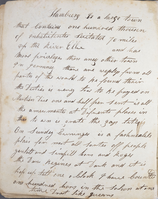 Hamburg Is a large town That Contains one hundred thousen [thousand] of inhabitentes [inhabitants] suitated [situated] 70 miles Up the River Elbe and has more privleges [privileges] then [than]aney [any]other town In Jermaney [Germany] thare [there] are vesles [vessels] from all partes of the world to be found their [there] the Duties is very low to be payed on Mertien dise [merchandise] one and half per sent [per cent]is all the amusementes [amusements] at difrents [different] plases [places] in this town is grate [great] the gas lites [lights] On Sundey [Sunday] Evninges [evenings] is a fashneable [fashionable] plais [place] for most all sortes [sorts] off [of] people gentell [gentle] and simpill [simple] hors [whores] and roges [rogues] the Dans [dance] begines [begins] at Dark and it is kep [kept] up till one o clock I have Counted one hundred hors [whores] in the saloon at one time Drest [dressed] like queans [queens]