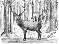 A pencil drawing of 2 deer in a wooded area. One deer is a large stag in the foreground facing the left, with the head turned toward the viewer. The second deer is a younger stag located behind the larger stag's flank. The younger stag is facing away from the viewer, with its distinctive white tail showing. The younger stag's head is turned back towards the viewer.