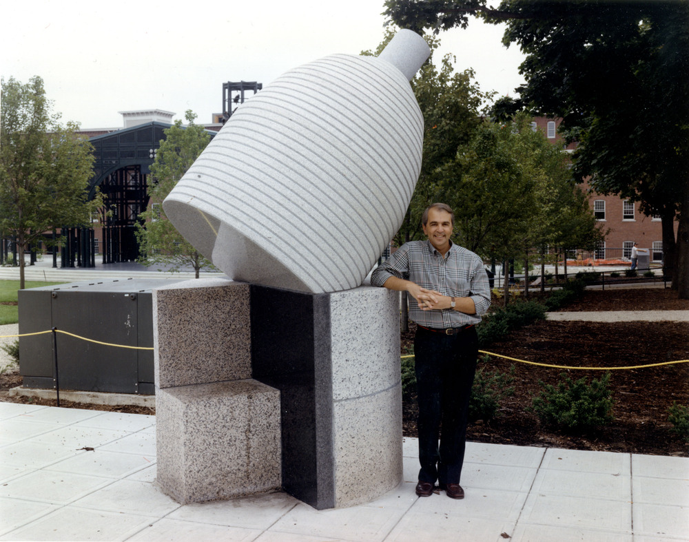 In 1990 artist Robert Cummings unveiled a series of three sculptures for Boarding House Park. Here Senator Paul Tsongas poses with Sculpture Two.