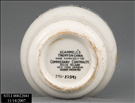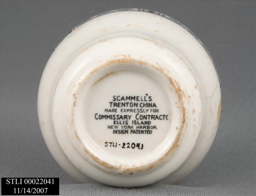 WHITE WARE W/BLACK "URN-LIKE" BORDER NEAR THE RIM. NO HANDLES ON CUP. CUP CURVES INWARD FROM TOP. NEAR THE BOTTOM IT CURVES OUT A LITTLE AND THEN INWARD TO A RAISED BASE BOTTOM. ON THE BOTTOM PRINTED IN BLACK IS:"SCAMMELLS/TRENTON CHINA/MADE EXPRESSLY FOR/COMMISSARY CONTRACT/ELLIS ISLAND/NEW YORK HARBOR/DESIGN PATENTED". DISCOLORED, WORN, CRACKED, CHIPPED AND STAINED.'
