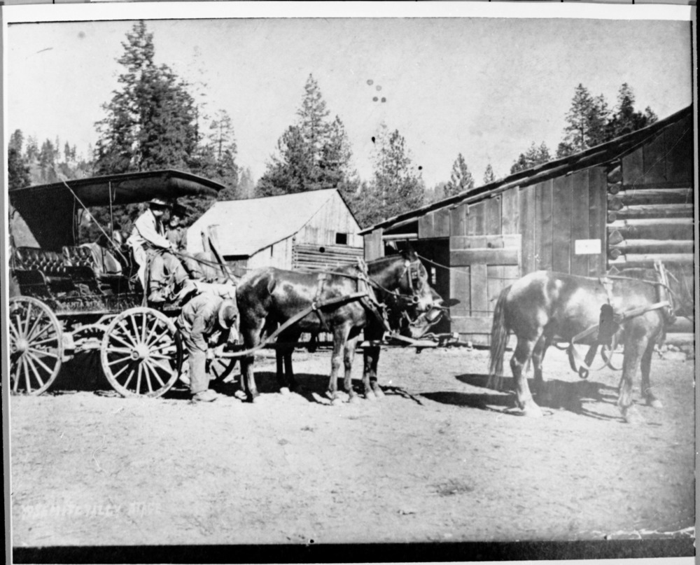 Stage coach "Yosemite" at the Wawona Hotel. Al Stevens - Driver; John Washburn - man standing with beard; and Clarence Washburn (?).