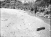 Channel change #2 before turning river through. New Civilian Conservation Corps (CCC) rock quarry opened up to complete river projects. Man on bank. ; ZION Museum and Archives Image ZION 13651 ; ZION 13651