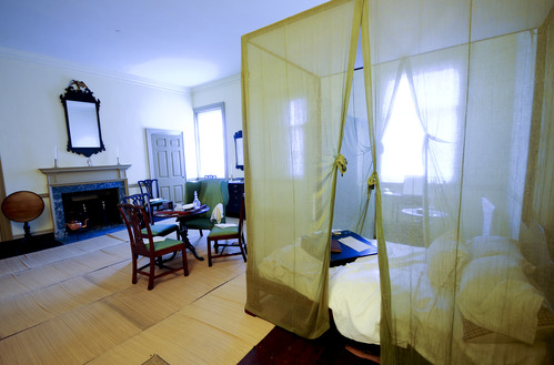 A color photo of Bishop White's bedroom with a four posted bed draped with thin gauze mosquito netting in the foreground and a table surrounded by mohagony chairs in the background.