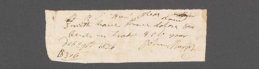 On front of document: "Mr RP Hunt Pleas [Rand?] Smith have three dolars six Cents in trade & ob your John Murphy dec 29th 1826 $3 06" On back of document: "J. Murphy [and amounts from another document]"