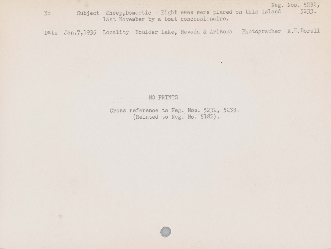 Sheep, Domestic--Eight ewes were placed on this island last November by a boat concessionaire. Locality: Boulder Lake, Nevada and Arizona . Negative #: 5232-5233