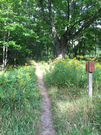 North Country Trail marker and waste-high goldenrods frame the dirt path as it heads into the wood.