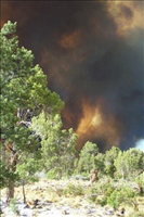 Full fire with black smoke in wooded areas during Long Mesa Fire at Mesa Verde National Park, July 29-Aug. 4, 2002