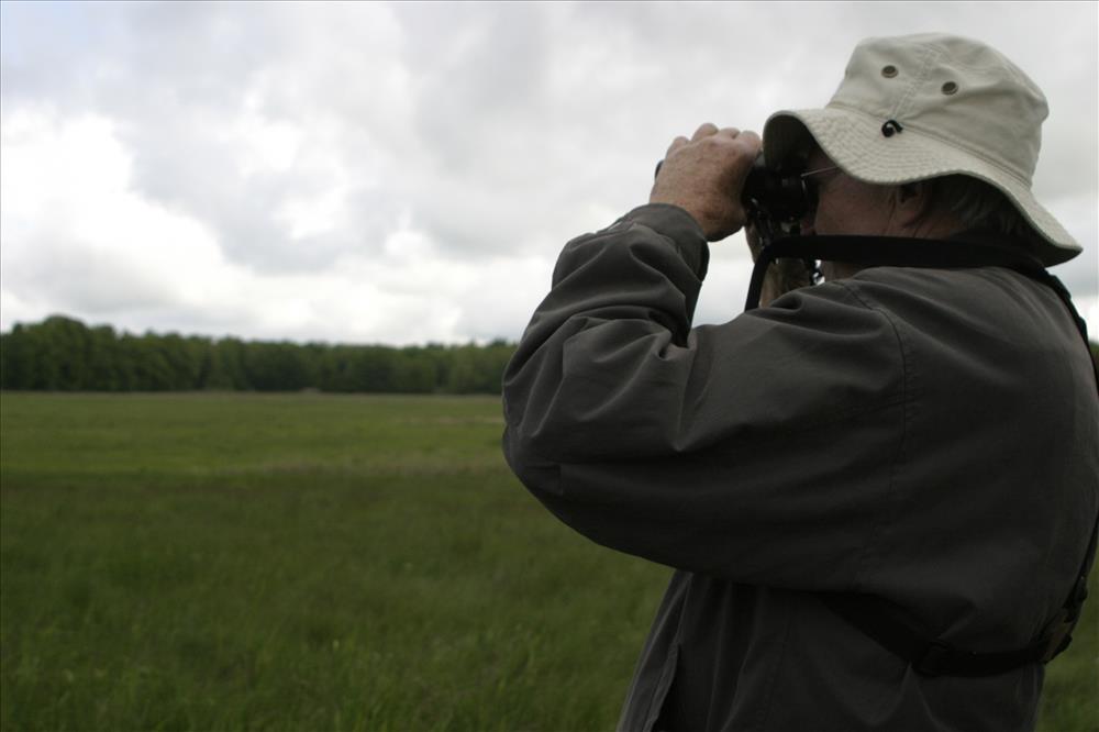 Cuyahoga Valley National Park is designated an Important Bird Area by the Audubon Society of Ohio, in part because of the restored grasslands at the site of the former Richfield Coliseum. A property once known for its sports/concert arena is now managed by the National Park Service as a grassland for rare birds. Cuyahoga Valley National Park offers year-round programs on bird watching. || Visitors bird watch with Park Ranger Paul Motts at an interpretive program called After the Coliseum in 2006. The program was an opportunity for local residents to learn how the park intends to manage this newly restored property.