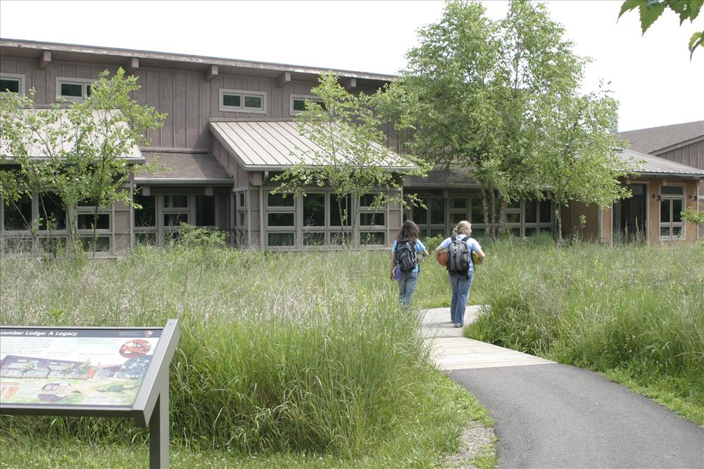 Since the mid-1990s, Cuyahoga Valley Environmental Education Center has offered a variety of summer residential camps. River Run - Theatre: "Fantasy in the Forest" is provided in partnership with Magical Theatre Company. Children entering grades 5-10 work with professional faculty to develop their performing arts skills in acting, voice, movement, and stage combat. The short performances are outdoors and integrate into the natural setting of the CVEEC campus. || Campers walk outside November Lodge, the main activities building at CVEEC.