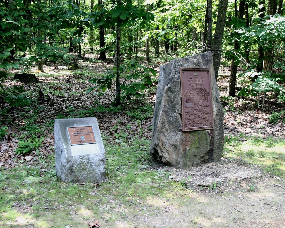 Monument erected to commemorate & mark the position of the 12th New Jersey Regiment during the Battle of the Wilderness May 5-6, 1864. Rededicated in 1964 by State of New Jersey during Civil War Centennial. || Mn & marker. Monolithic rough-cut shaft, 56"Wx42"D at base, tapering to 20"D at apex, x 7'H, w/ 30"x20" bronze plaque. Dedication marker, 24"Lx18"Dx30"H, with chamferred polished face & 18"x12" bronze plaque & raised inscription.