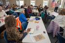 Room full of people sitting at tables facing a man speaking in upper right hand of image.