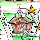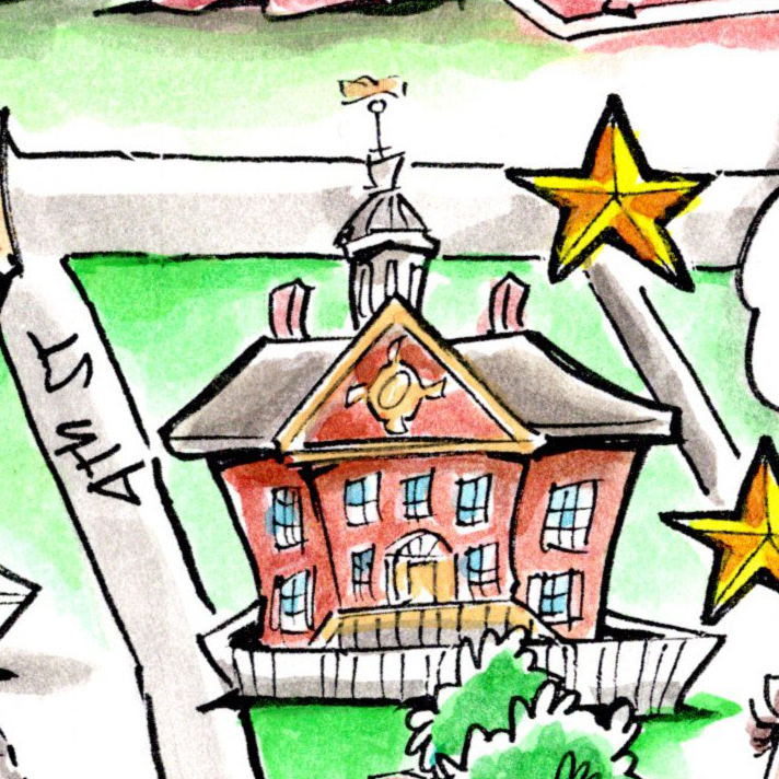 Cartoon drawing of a colonial style red brick building with a white cupola surrounded by a white fence.