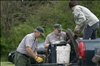 RiverDay is an an annual day of service and celebration in the Cuyahoga Watershed. Activities are coordinated by Friends of the Crooked River. Cuyahoga Valley National Park is a partner. Our volunteers remove trash from dump sites in several locations and invasive plants from the area around Howe Meadow. || NPS staff and volunteers load garbage and bagged invasive plants into dumpster on RiverDay.