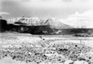 Bridge Mountain from Oak Creek Canyon. Two-track road and building in foreground. ; ZION Museum and Archives Image 10003 ; ZION 10003