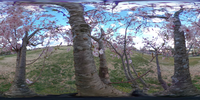 Spherical image inside of a grove of cherry blossom trees in full bloom with pink blossoms