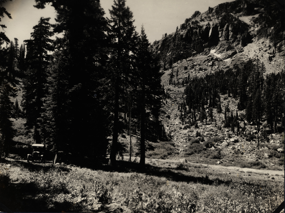 Benjamin F. Loomis Historical Photograph Collection:West end of Crescent Cliff showing path of mud flow. A car is parked among trees at lower left