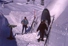 Two people stand at the entrance of a metal tunnel buried in deep snow.