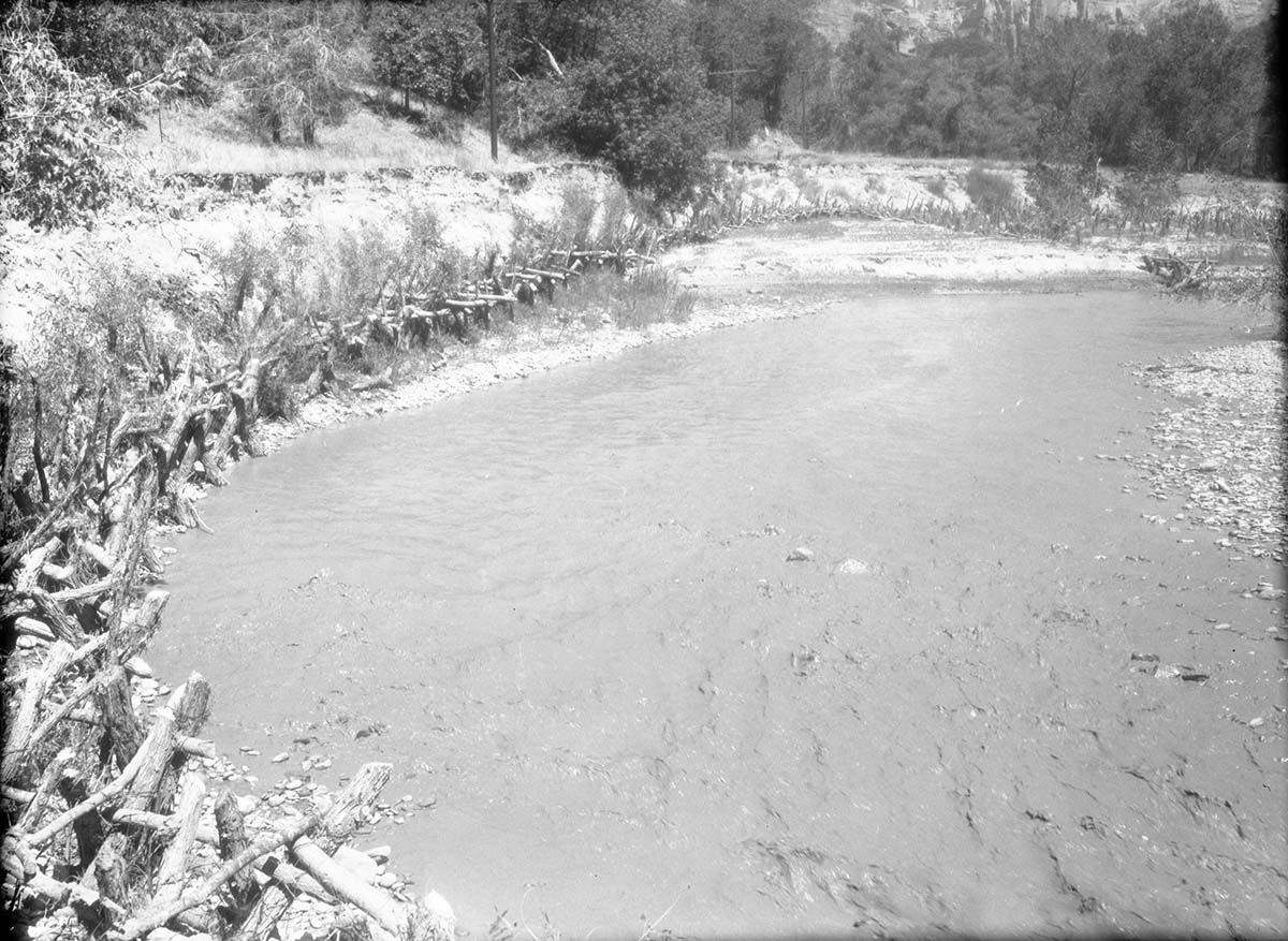Tree and cable jetties on Virgin River opposite Wiley camp drainage in need of repair after heavy spring floods. [Scratches, pits, fingerprints] ; ZION Museum and Archives Image ZION 9346 ; ZION 9346