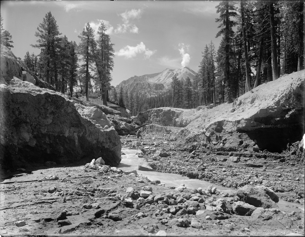 Benjamin F. Loomis Historical Photograph Collection:Terminal moraine on Lost Creek washed out by mudflow. Geologist J.S. Diller (see LAVO PH Coll 14) is kneeling in washout at center and Lassen Peak is in background