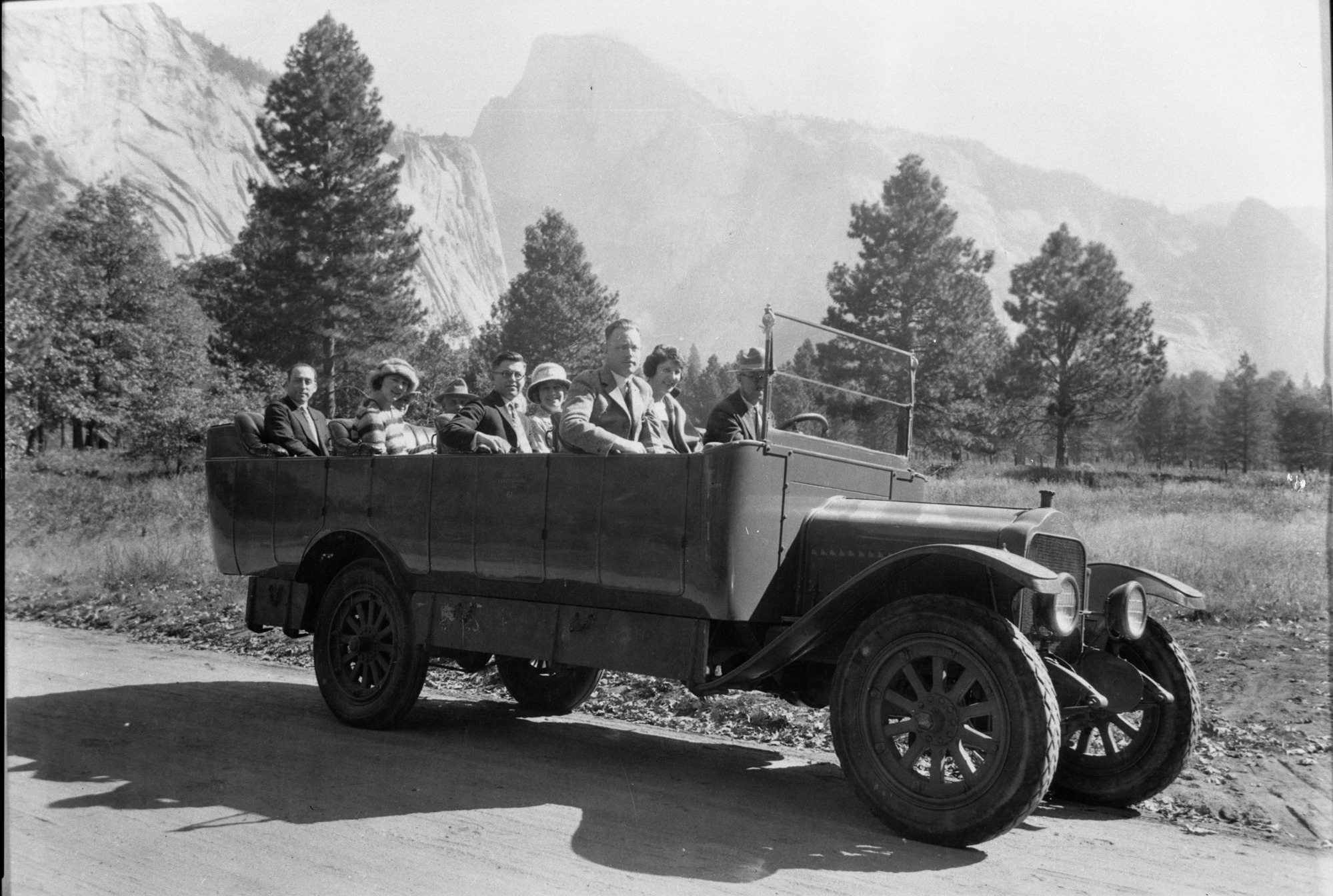 First regular autostage into Yosemite Valley. Mr. Edwin T. Huffman on June 2, 1915, drove the first auto stage of Yosemite Stage and Turnpike Co. into Yosemite Valley over the Wawona Road. This picture taken at that time by Julius Theodore Boysen marked pa
