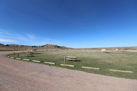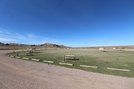 a grassy expanse with picnic tables and prairie dog mounds surrounded by a dirt-gravel road