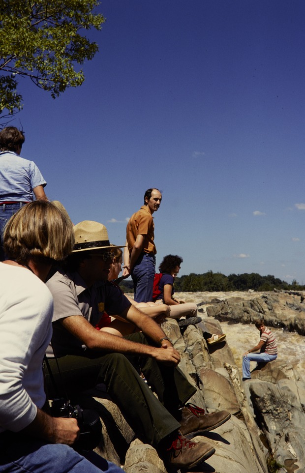 NPS employee sitting with visitors at Great Falls Park.