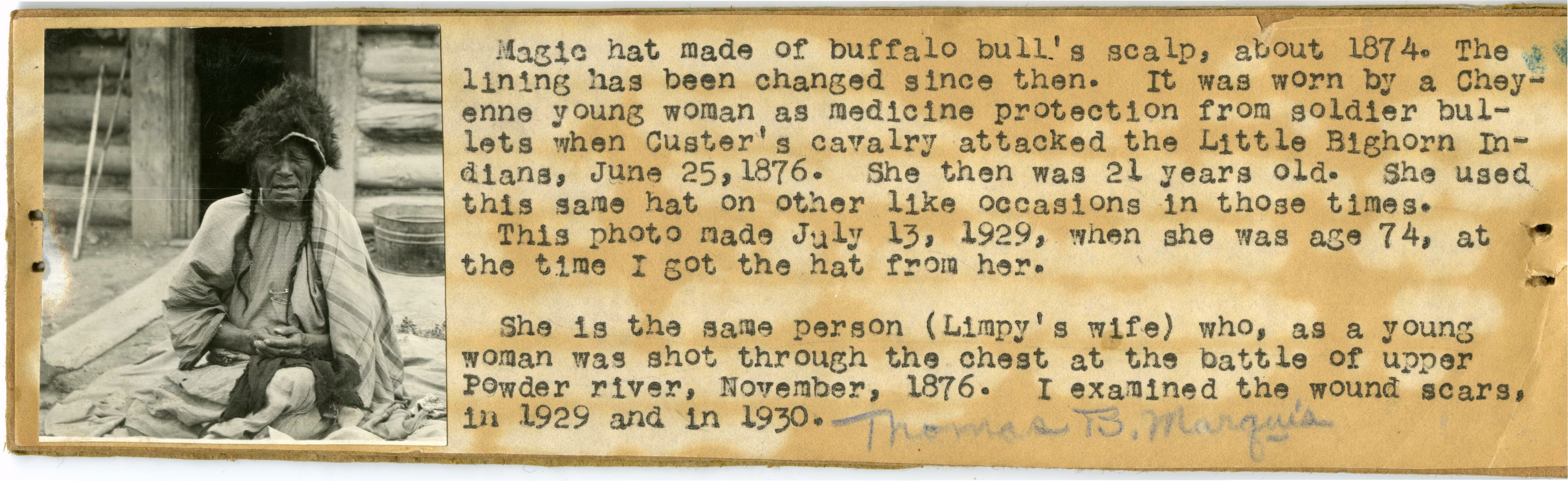 LIBI_00012_07518; A black-and-white photograph of Limpy's wife wearing buffalo bull's scalp. The photo was taken on July 13, 1929, when she was 74 years old. The description alongside of print reads, "Magic hat made of buffalo bull's scalp about 1874. The lining has been changed since then. It was worn by a Cheyenne young woman as medicine protection from soldier bullets when Custer's cavalry attacked at the Little Bighorn on June 25, 1876. She then was 21 years old. She used this same hat on like occasions in those times. This photo made July 13, 1929, when she was 74 years old, at the time, I got the hat from her. She is the same person (Limpy's wife) who as a young woman was shot through the chest at the Battle of Upper Powder River in 1876. I examined the scars, in 1929 and in 1930." Signed by Thomas B. Marquis at the bottom of the mount.; print, photographic [mounted on card]; Courtesy of the National Park Service, Little Bighorn Battlefield National Monument, LIBI_00012_07518, Thomas B. Marquis
