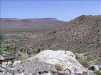 Remains of a vat that was used to process gold ore with cyanide at the Bonanza King Mine. The vat is sitting on the edge of a large tailing pile that is at the head of a wash. The pile is approximately 35 to 40 feet tall and the contaminated sediment is moving downstream.