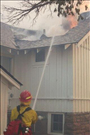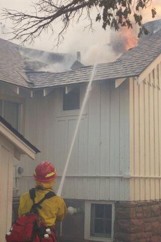Firefighters battle flames in structures during the Long Mesa Fire, Mesa Verde National Park, July-August 2002