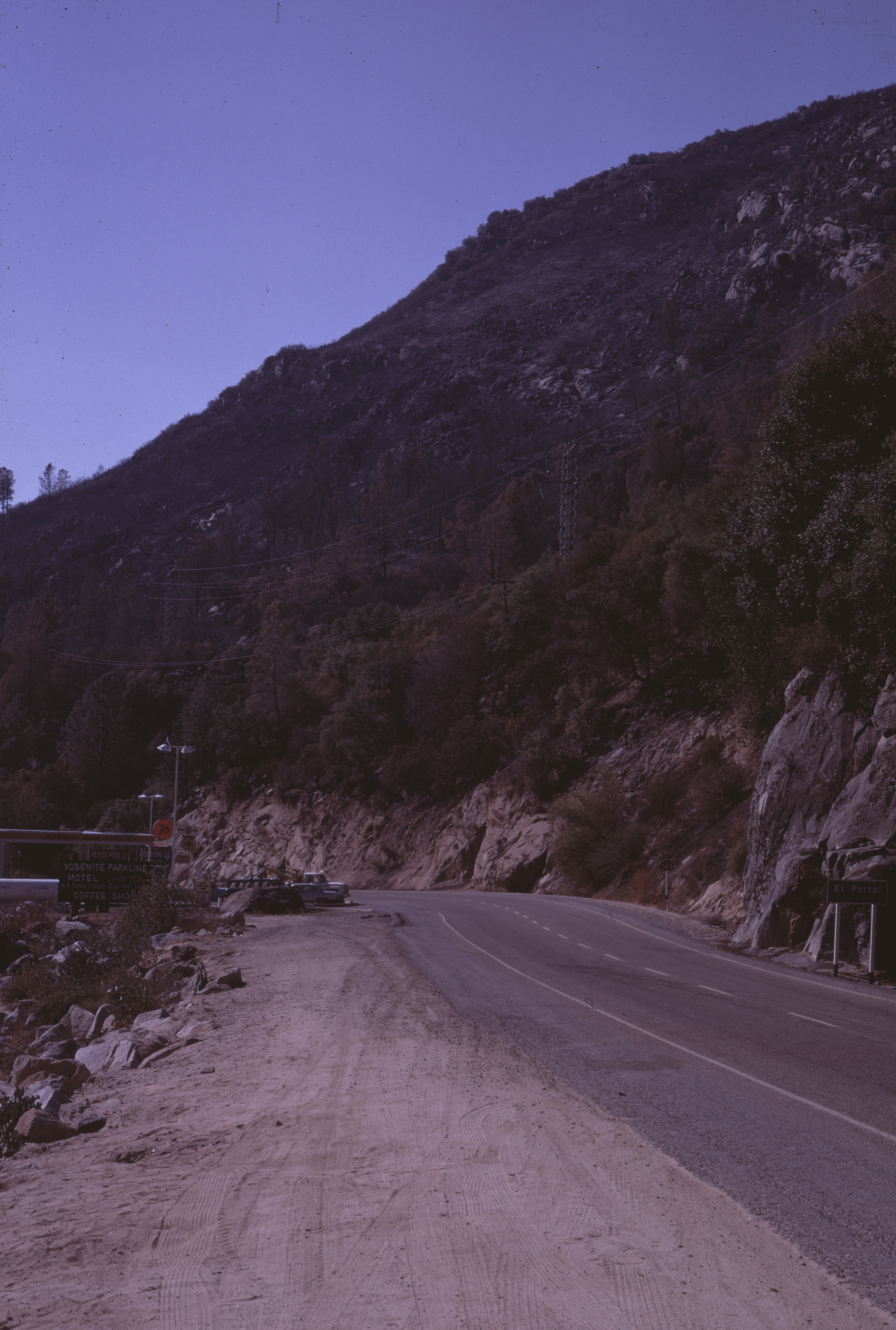RD82. October 1968. Gulf gas sta. near W. park boundary [Gulf gas station near western park boundary]. [Fire near El Portal]. Robert Dunnagan. J-01-25-082.