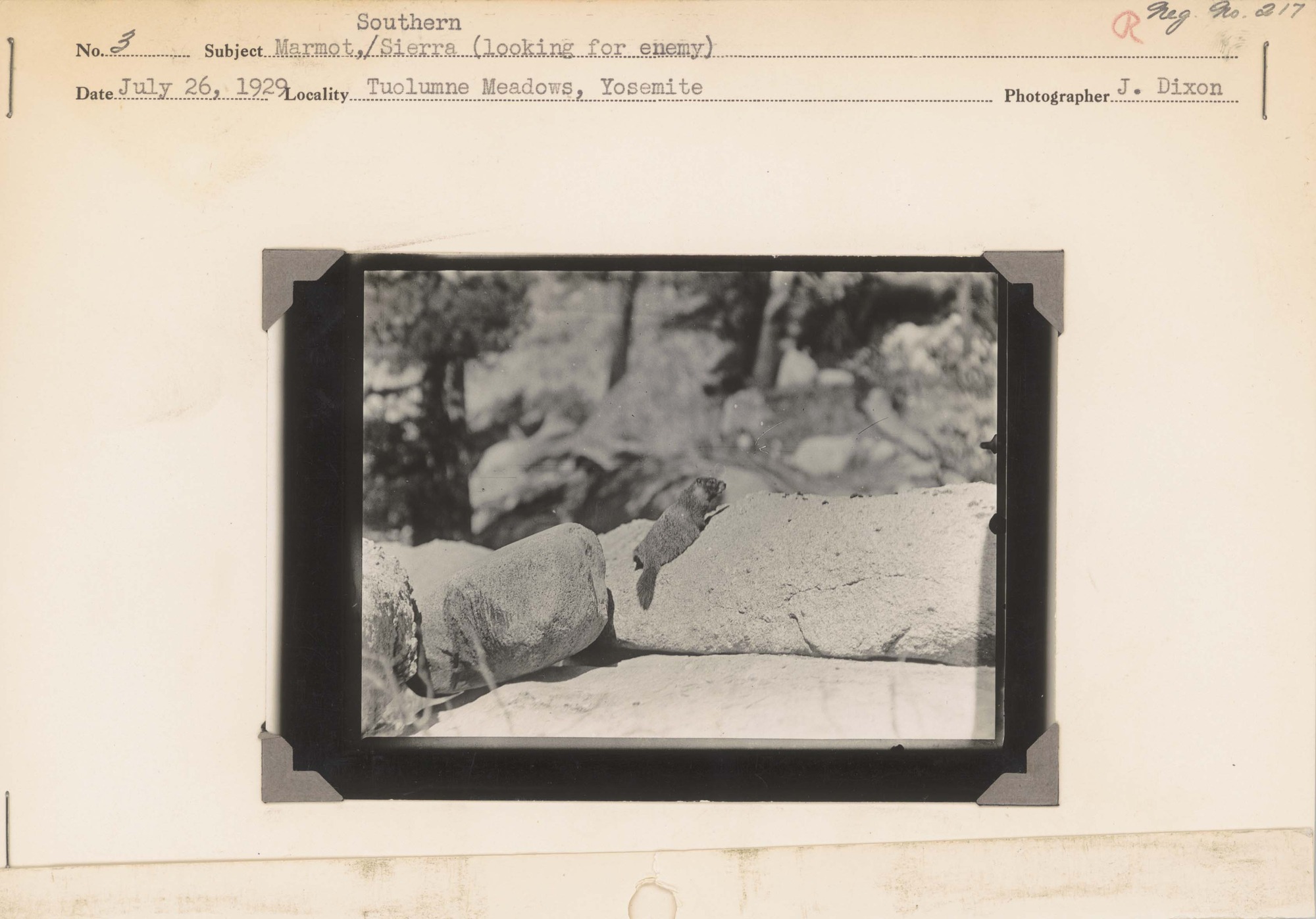 Marmot, Southern Sierra (Looking for enemy). Locality: Tuolumne Meadows, Yosemite . Negative #: 217