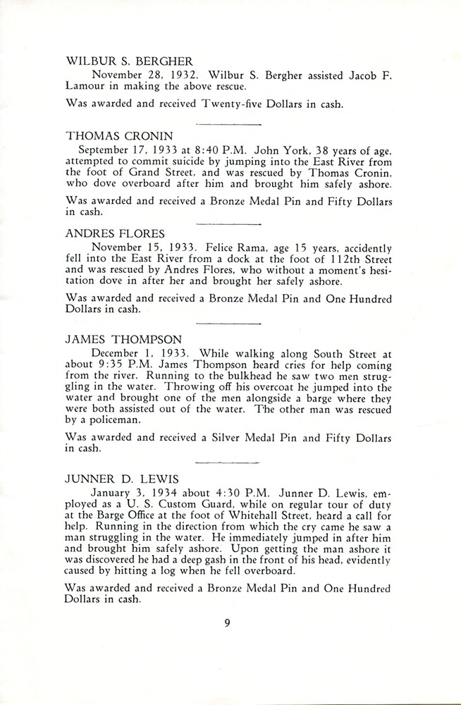Booklet from the Life-Saving Benevolent Association of New York titled, "Report 1934/ Statement of Donations and Awards/ Directions for Restoring Apparently Drowned". Report details committee members, awards to individuals for rescues, and first aid instructions for drowned individuals. See following entries for other pages: "Booklet, Life-Saving Benevolent Association, 1934 p.1.tif" to "Booklet, Life-Saving Benevolent Association, 1934 p.23.tif"