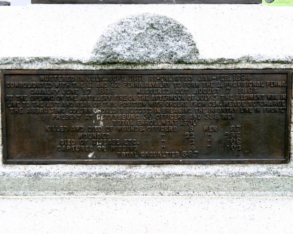 1 of 110 Monuments to Pennsylvania. Erected as Commemoration to 1st PA Cavalry, position was at left rear of this site. Held in reserve for action if Webb's PA Infty line was broken. LF&RF Mkrs 78' N-S of Mn. Located E side Hancock Ave. || Mn & 2 Flank Mkrs. MN: base 5'3"x4'4", truncated shaft finished & rough-cut stone w/ bronze tablets, bas-relief, medallions, topped by dismounted Cav. soldier. Flk Mkrs 1'sq x 1'6"H. Statue cleaned & treated. Mkrs chipped, faint inscription.
