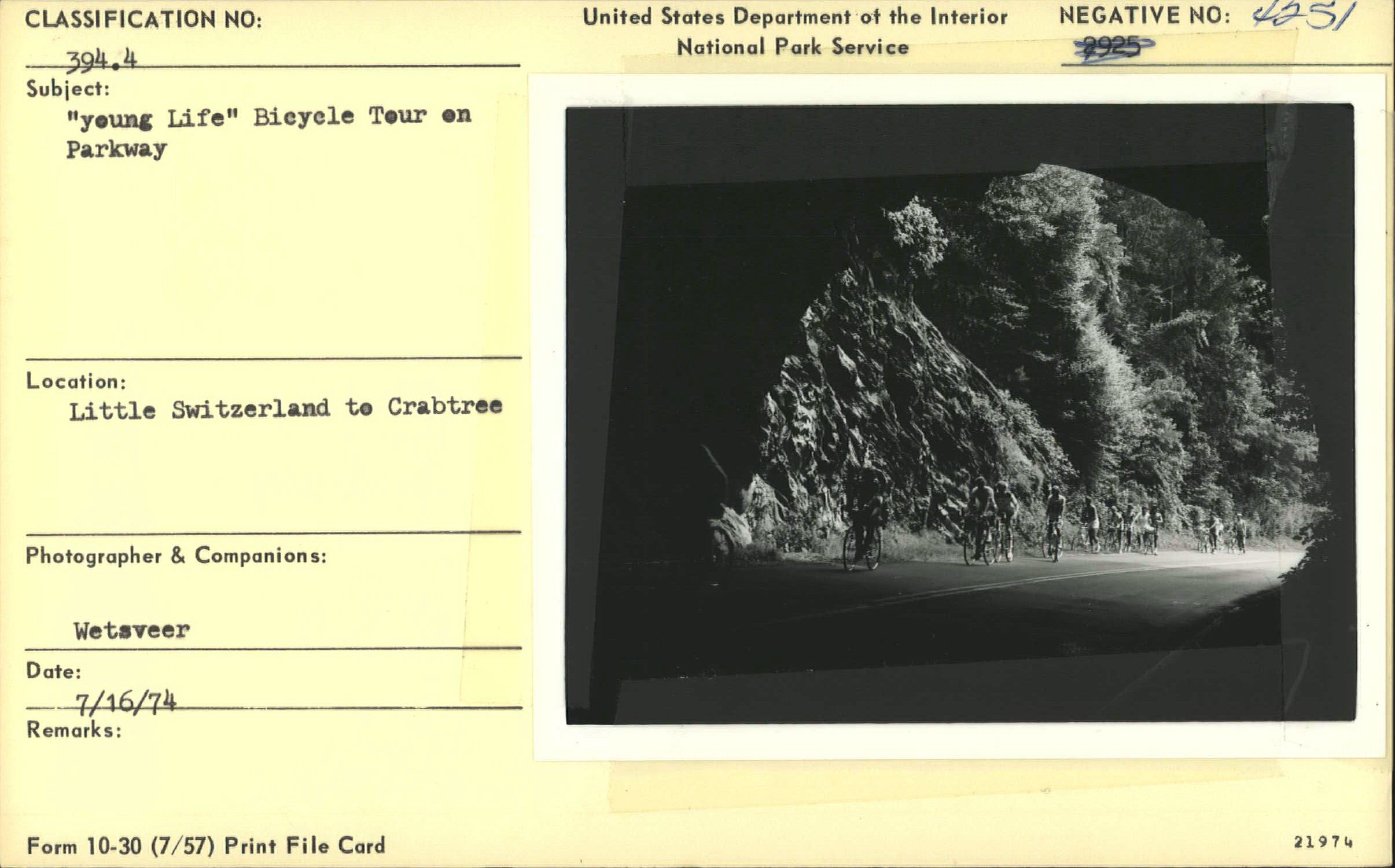"Young Life" bicycle tour on the Parkway, near Wildacres Tunnel