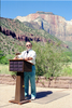 Color Photos of the parks 72nd anniversary celebrations- cake cutting, barbecue, speakers. Superintendent Harold Grafe serving cake. ; ZION Museum and Archives Image 800_21_01022 ; ZION 15933