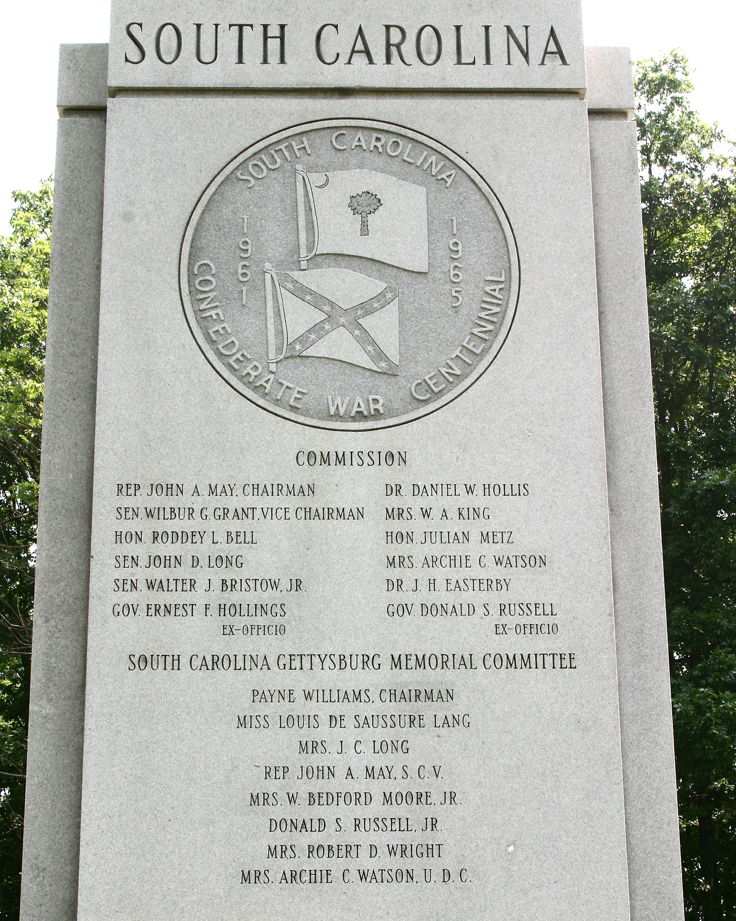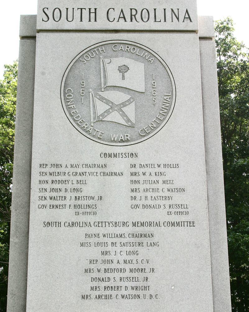 Commemorates South Carolina troops who fought with CS army in Battle of Gettysburg. Occupies ground where Kershaw's South Carolina brigade had massed on July 2 & 3 1863. Located on Section 4, Confederate Ave. || Monoliths, 5'5"x2'6", on base 3'9" wide, 23' long. Overall 14'2" high. Cut inscriptions on E & W. Outline of State, State seal, narration & listing of SC regiments on E. Carving of SC flag & CS flag & State commissioners on W. 2 marble benches.