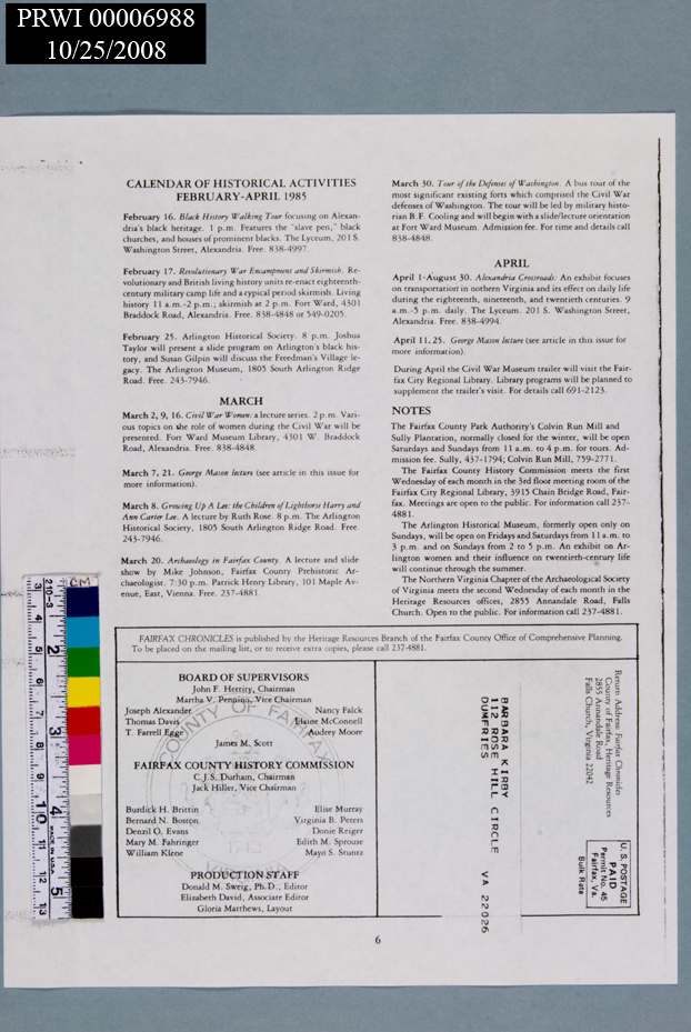 HISTORY. BLACK AMERICANS. 1985. ALEXANDRIA SLAVE PEN. 4+ PAGES.<CRFAIRFAX CHRONICLES. ALSO THE FALLS CHURCH COLORED SCHOOL.<CRPHOTOCOPY. BY ARTEMEL, PARKER & RAMOS.<CR<CR<CRCATALOG # ON BACK. GLOVES FOR HANDLING.