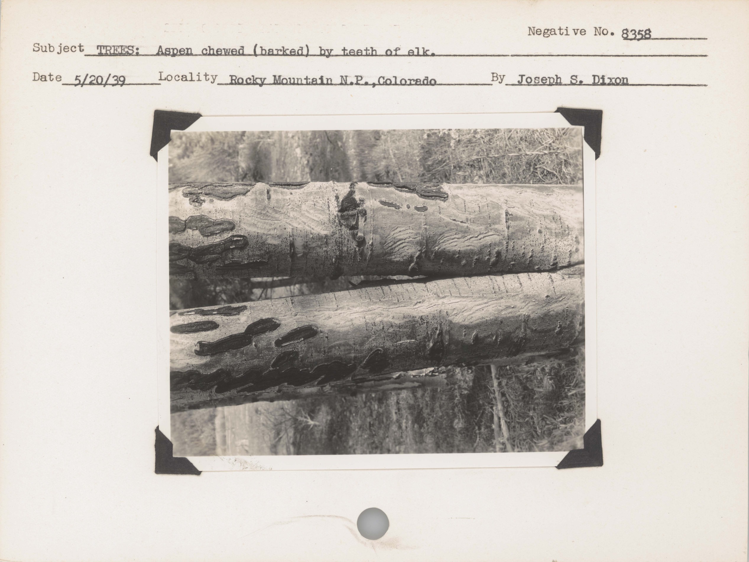 Trees: Aspen chewed (barked) by teeth of elk. Negative #: 8358. Locality: Rocky Mountain National Park, Colorado.