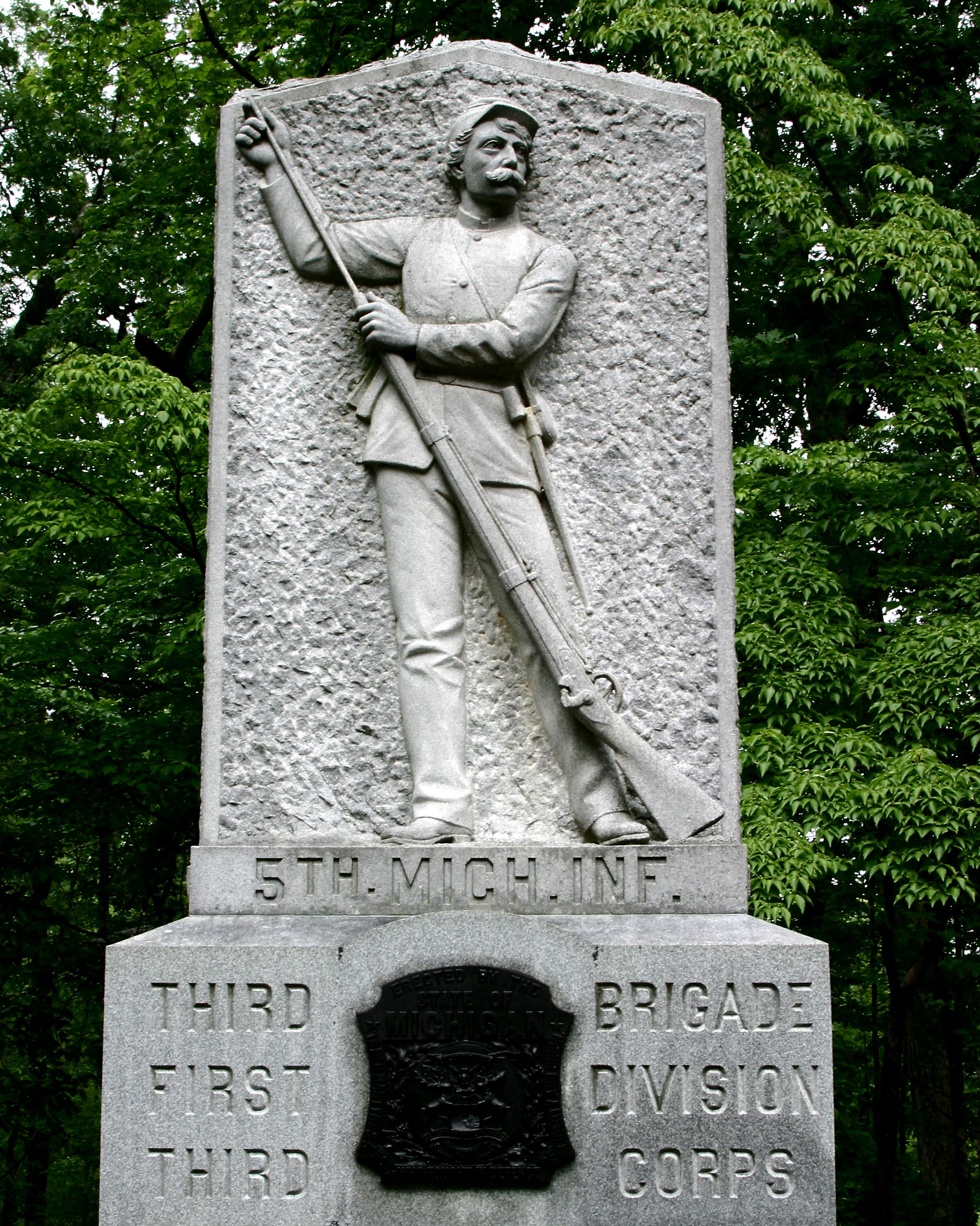 1 of 9 mns in Park honoring Michigan soldiers at Gettsyburg. Marks position held by regiment about 4:30 pm on July 2, 1863. Located on N side of Sickles Ave near Loop and Wheatfield. || Rough-hewn base, 6'3"x4'11", hammered & smooth shaft, 4'x2'7", 10'6" high. Sculpted relief of infantryman loading his musket & bronze State seal aborns S side and historical inscription incised on N side. Set on native boulder.