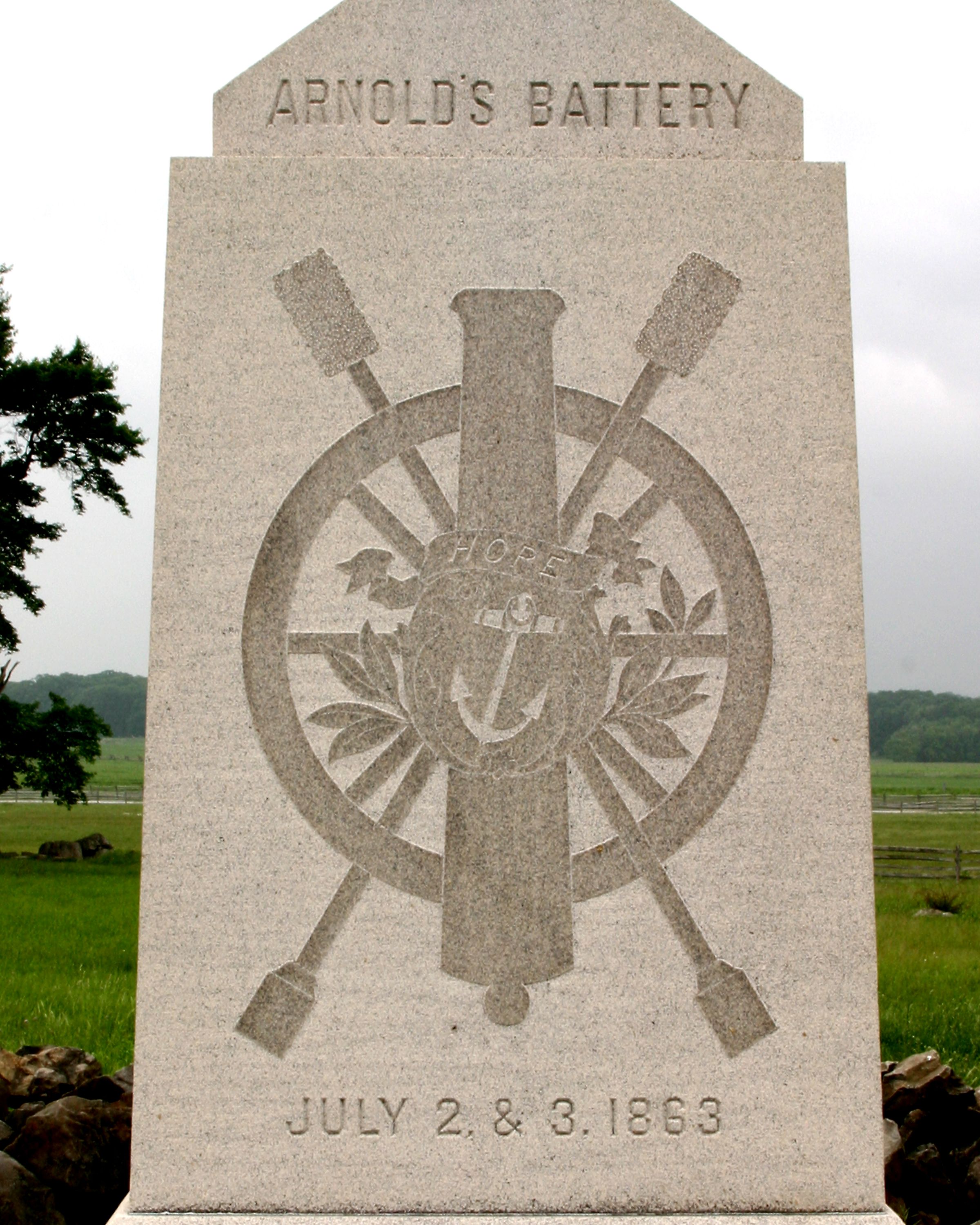 1 of 4 monuments to Rhode Island. Indicates 1st position Battery A, 1st RI morning Jul 2,1863. Jul 3, 1863, exhausted ammo, retired from field to avoid capture. 3 cannon associated w/Mn. Located W side Hancock Ave, N of Angle. || MN & 4 Cannon. Mn: base 4'-6" sq, 2 part stepped shaft, cap w/trefoil design at apex. incised inscriptions N-S elevations. polished granite crest E elevation framed by incised inscrip. 4 Cannon mounted 2 S, 2 N, 1 by Andrews Sharpshooters.