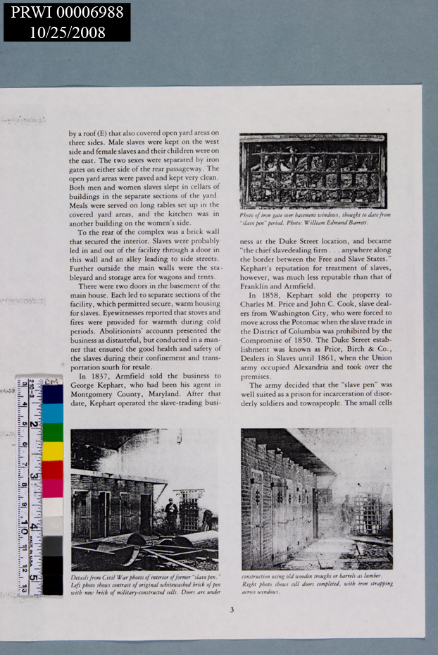 HISTORY. BLACK AMERICANS. 1985. ALEXANDRIA SLAVE PEN. 4+ PAGES.<CRFAIRFAX CHRONICLES. ALSO THE FALLS CHURCH COLORED SCHOOL.<CRPHOTOCOPY. BY ARTEMEL, PARKER & RAMOS.<CR<CR<CRCATALOG # ON BACK. GLOVES FOR HANDLING.