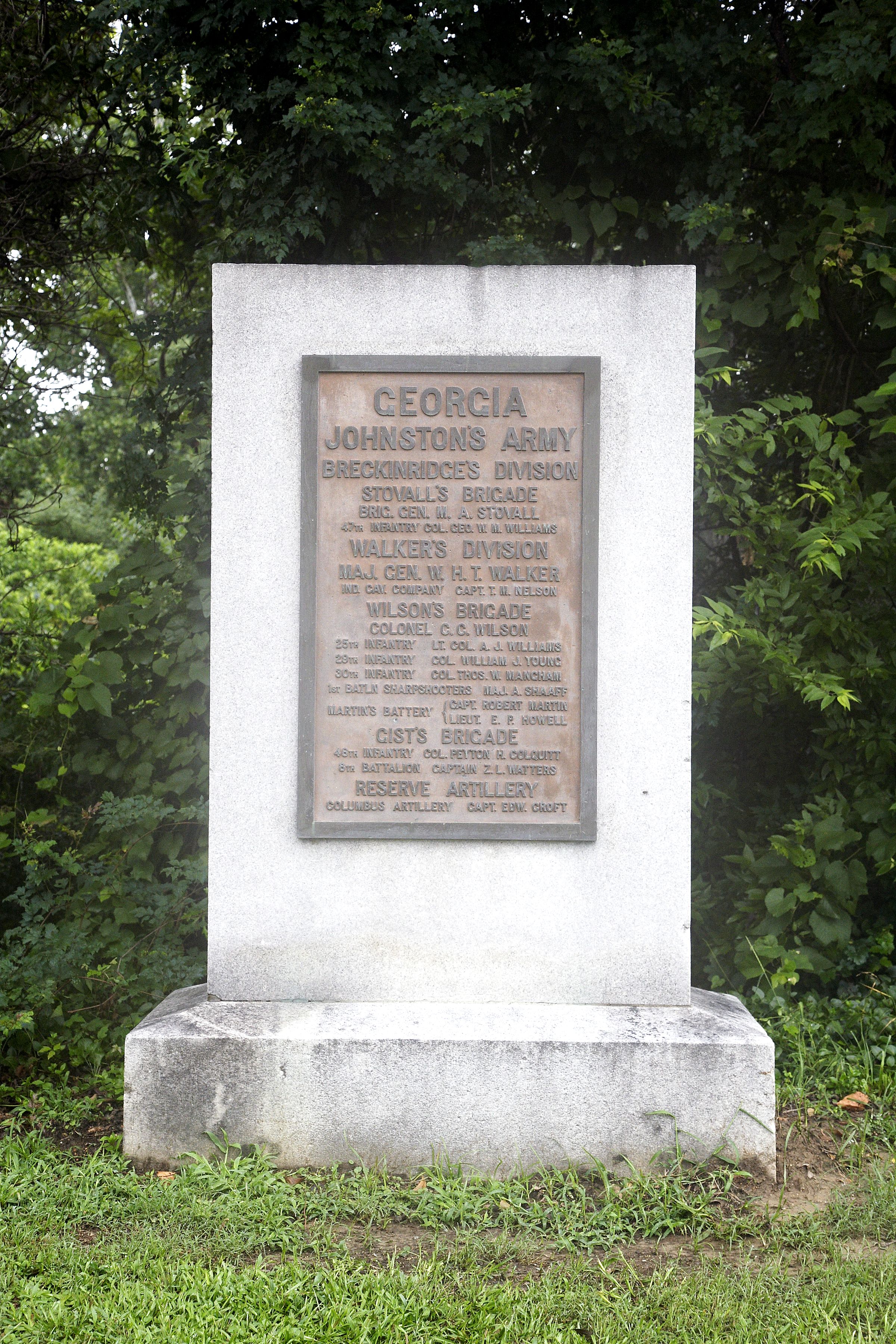 4'5"x 2'25"x 6'8", this is a hammered-finish, rectangular gray granite monument set on a simple rectangular base. Attached to face is a rectangular bronze inscription tablet with unit designations and campaign history.