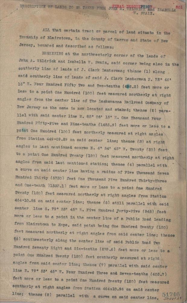 003 page 1 Lands to be taken from John A. Wildrick and Isabella M. Swain--Blairstown, NJ--Final Description