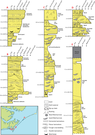 Vertical sequences of shallow sediments below the park. Figure has 5 cross sections that show sand, shell material, rip-up clasts, rooting, mud- or sand- filled burrows, horizontal laminations, planar laminations, trough cross bedding, parallel laminations, and/or mud lenses, in addition to relative size of clasts.